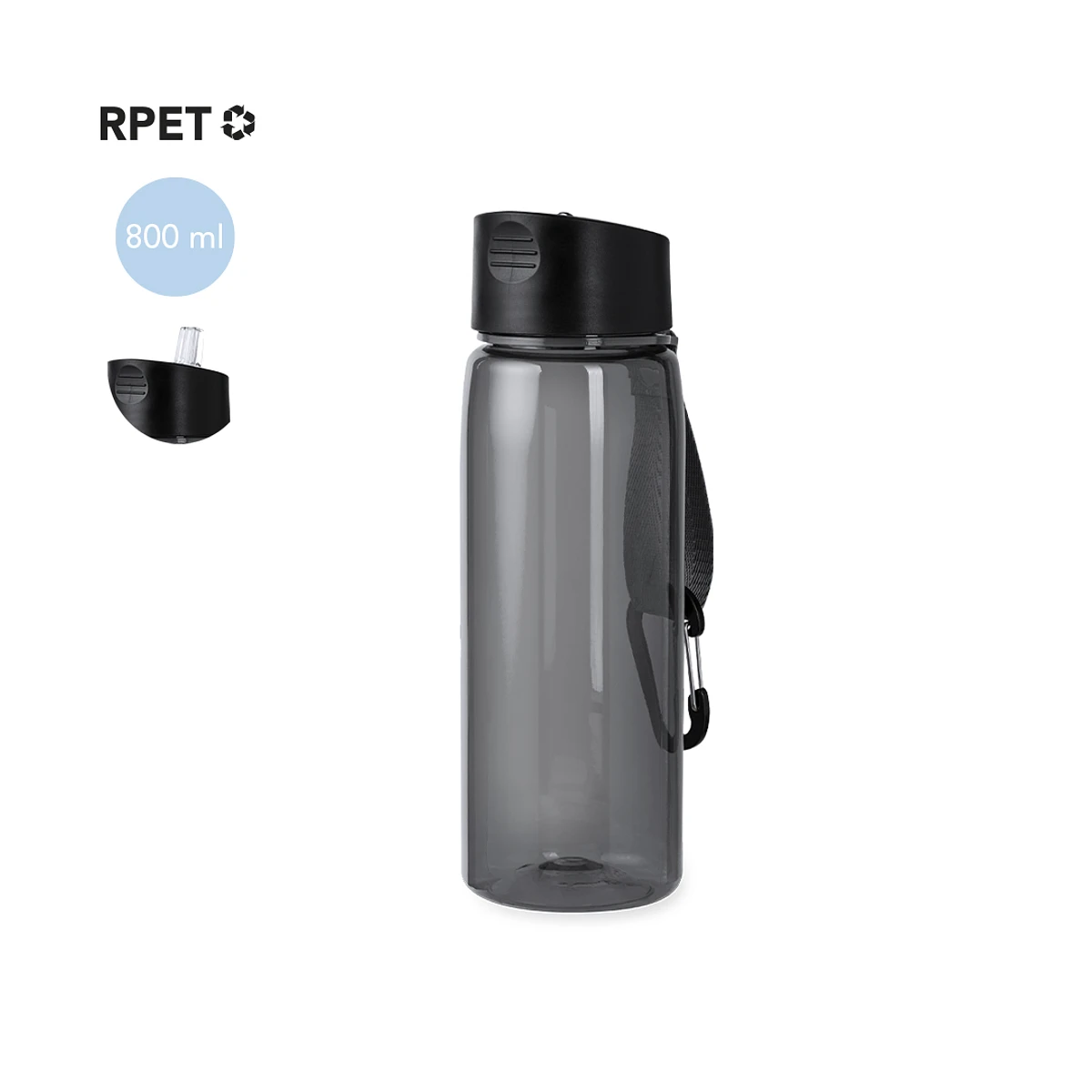 800 ml jug made of sturdy RPET with a transparent finish in a variety of colors. Black screw cap, with dispenser and foldable dispenser. Comes with a matching transport strap and a metal carabiner for easy carrying. Available in a variety of colors. RPET material is made from recycled plastic, to promote the reuse of plastic waste and help with the planet's sustainability.