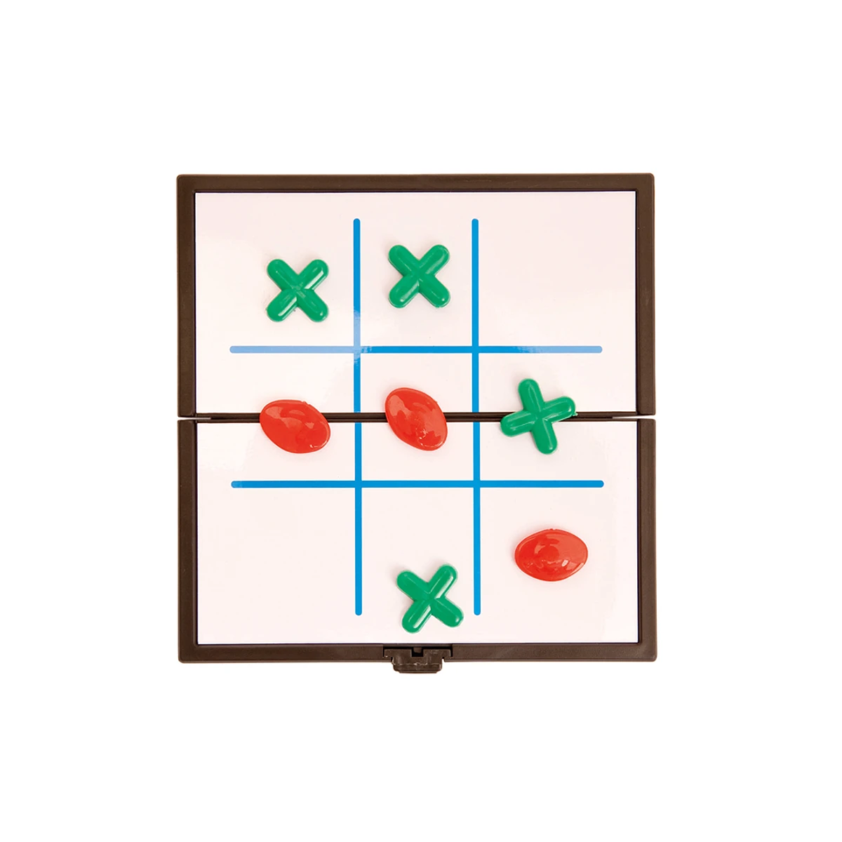 Folding board game with metallic surface and magnetic pieces. Parcheesi, tic-tac-toe and checkers available. Presented in individual box.