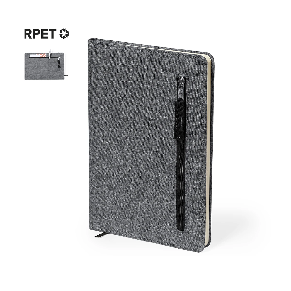 Bloc de notas fabricado en RPET 300D. Con tapas duras y bolsillo exterior con cierre de cremallera, incluye 100 hojas a una raya con marcapáginas. De elegante color gris y presentado individualmente en bolsa reciclada. Logotipo RPET en contraportada.El material RPET se elabora a partir de plástico reciclado, para así fomentar la reutilización de residuos plásticos y ayudar a la sostenibilidad del planeta.