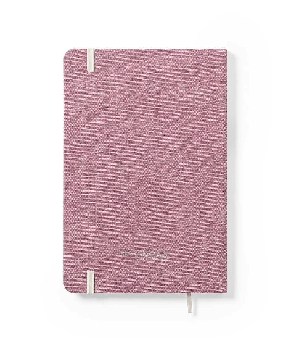 Bloc de notas de línea nature fabricado en 100% algodón reciclado. Con tapas duras y elástico de sujeción en contraste. Interior con 100 hojas lisas y marcapáginas de tela. Disponible en amplia gama de colores, con distintivo algodón reciclado en la contraportada. Certificación GRS (Global Recycled Standard / Estándar de Reciclaje Global), que garantiza el origen reciclado del material usado para fabricar el producto