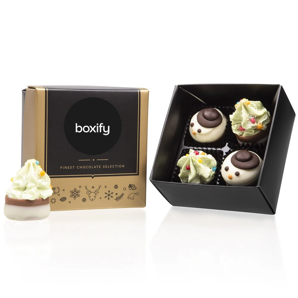 Cajita regalo de 4 divertidos chocolates de Navidad para sorprender a los más golosos. Personalízala con tu logo en etiqueta a todo color y sorprende desde el estómago!